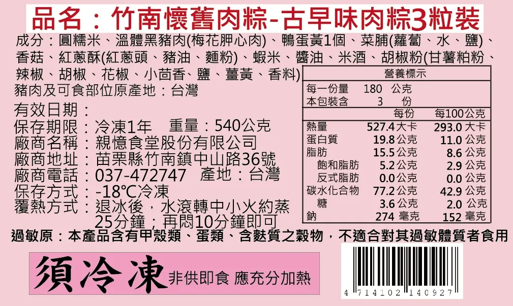 竹南懷舊肉粽深受各大媒體與美食家的讚賞,從原料採買、清洗處理、內餡製作到包粽過程皆秉持一貫處理,其肉香、粽香融合,米粒均勻的吸收了香味,用料簡單卻充滿濃濃的古早味。此次採用素有『黃金蛋』之稱的「開發牧場」所生產之蛋黃,無砷、無抗生素、無荷爾蒙、低膽固醇之特性,蛋黃香氣十足。讓您吃的健康又回味。並榮獲2018年蘋果日報評比量販組台灣粽第一名。